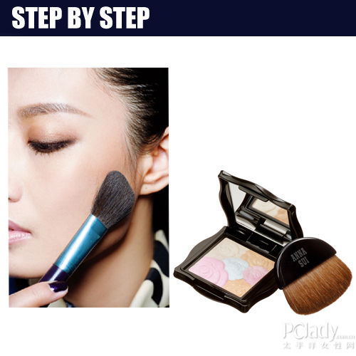 1、斜角刷沾取深色粉饼,在颧骨下方刷出凹颊。