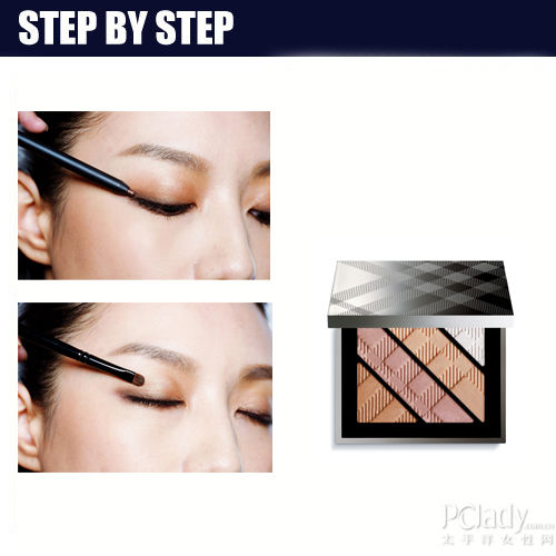 1、眼线上方叠上雾褐色眼影并晕染,模糊线条感。
