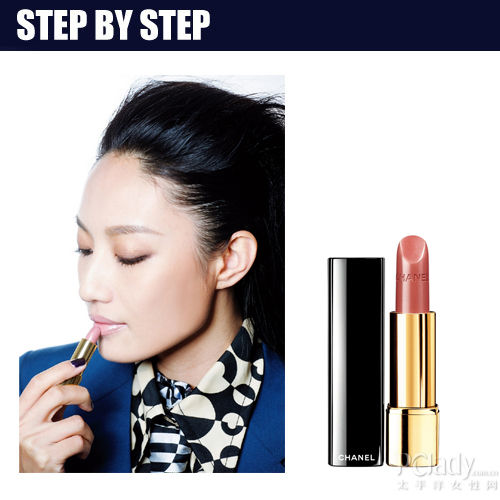 2、再用唇刷轻轻刷上虾肉色唇膏,稍显唇色即可,不用过于着力描绘樱唇。