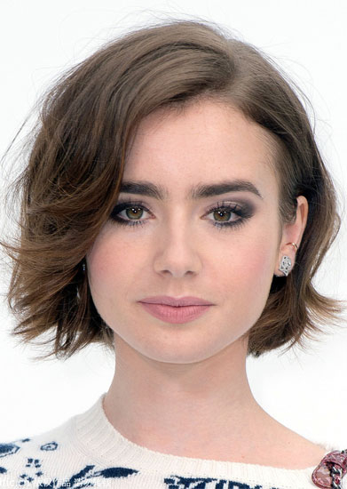 莉莉·柯林斯这款发型有着都市女性的摩登感,发尾处修剪的很薄,很碎,加上卷曲处理让发型灵动起来,飘散的碎发充满了空气感,干练又充满个性。