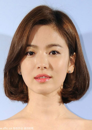 乔妹的这款短发类似于BOBO头,四六分加上发尾的内扣让宋慧乔显得知性而温婉。想要把这种有着民国学生头的发型演绎的时髦,偏分的处理与巧克力发色是关键。