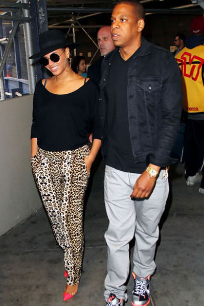 刚刚生好孩子的拉丁天后碧昂丝以黑色长T搭配棕色豹纹哈伦裤,再用亮粉色红底鞋来为整体LOOK提气。
