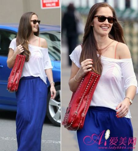 Queen B无论走到哪里都是星芒尽放,露肩T恤将Leighton Meester好看的肩部展示出来,而宝蓝色长裙更显出她的大气。
