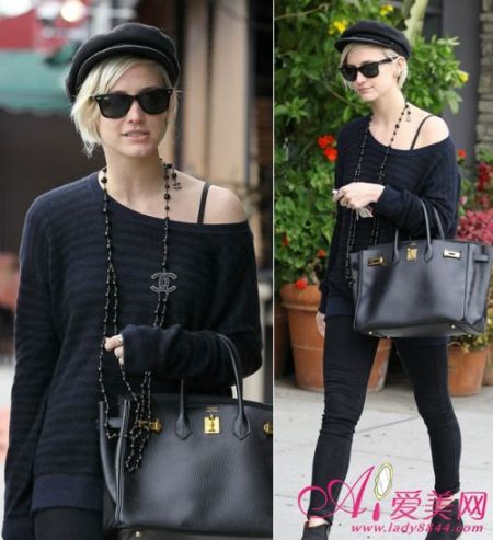 Ashlee Simpson自从剪了短发后穿衣打扮更加帅气利落,一身黑的装扮亮点全落在了露肩的部分,显得皮肤更加白皙。