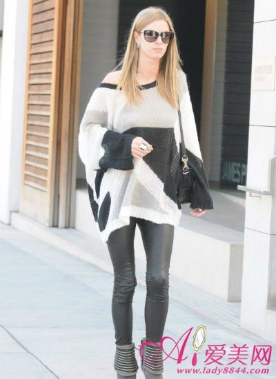 宽大的针织衫与打底裤搭配最好不过,而领口的宽大设计将一侧香肩稍微露出来,非常诱人的露肩装。