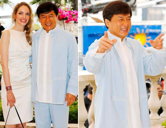 成龙(微博)大哥热情的笑容和戛纳的天气一样晴朗,天蓝色与白色组合的改良样式武术服,成龙像是刚从片场中走过来一样。