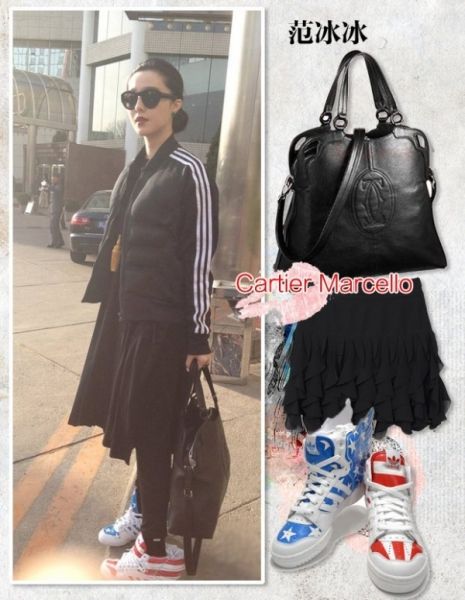 范冰冰春季出街挚爱卡地亚Cartier Marcello的黑色手袋,也不断转换自己的adidas潮鞋,红蓝的JS美国旗翅膀鞋,估计是现在最热门的款式了!