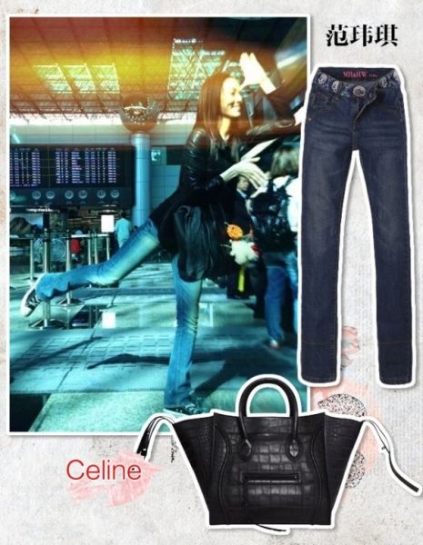 依旧是范范黑色Celine包包私搭,黑色小皮衣,秀出一头长发,机场还不忘搞笑,春季长腿妹妹都可以按这身装扮出街,不仅显瘦高挑,而且档次很高!