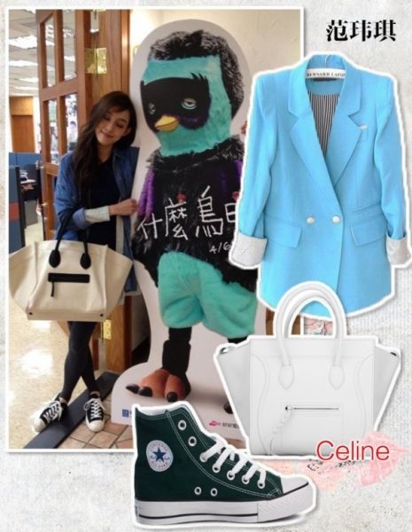 范玮琪出街,白色款Celine笑脸包,十分抢眼!糖果蓝的西装外套,细腿裤,匡威经典球鞋,休闲中还带着一些韩国风格,而且白色幻影系列笑脸包很新鲜突出,不同黑色的霸气,更有份文雅!