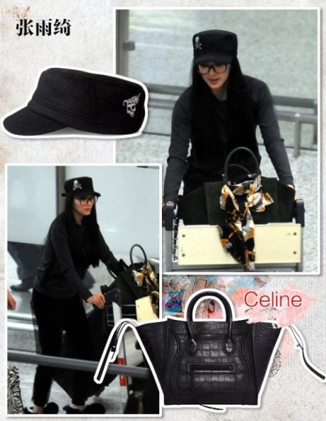 张雨绮全身黑色出现在机场,头戴骷髅平底帽,黑毛衣、黑裤、黑鞋、黑色幻影系列Celine笑脸包,十足的低调,除了这身黑色不可取外,黑色笑脸包倒是十分抢眼,走哪儿都可以让人回头多望几眼!
