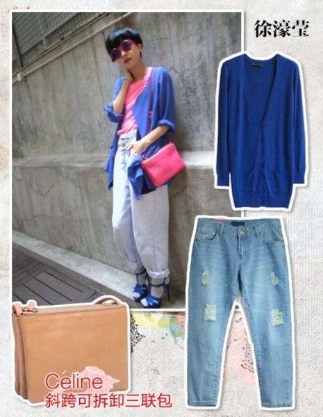 徐濠萦私搭从来不缺少时尚元素,这色是枚红色的Celine斜跨可拆卸三联包,蓝色针织衫,粉色打底衫,男友风牛仔裤,简单个性,混搭却好像有种和谐,现在的港女流行这种打扮!