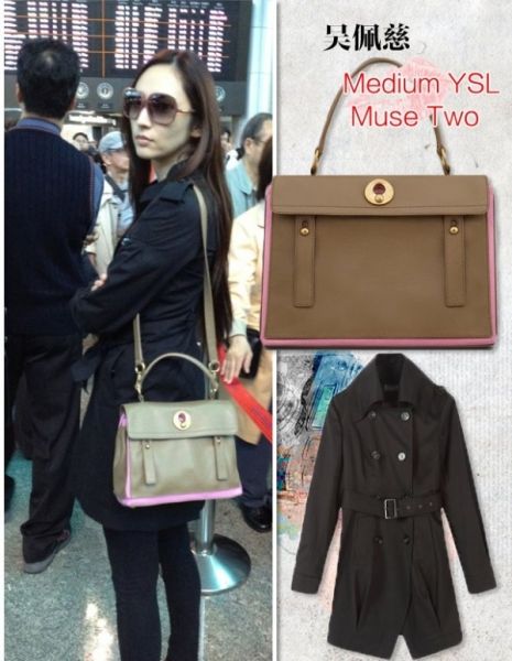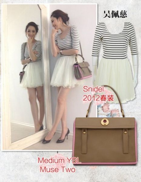 吴佩慈最近新包换不停,这款就是Medium YSL Muse Two斜挎包与Snidel 2012春装新连衣裙搭配,走体系小清新风格,美腿展露无疑!青春不失高雅,Medium YSL双色手提包,看似普通,却质感很好!