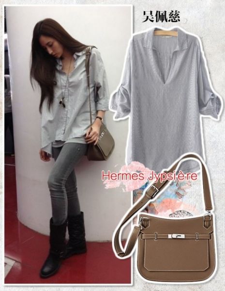 吴佩慈另一款新包包是新款Hermes Jypsière 大象灰斜挎包,中袖衬衣,灰白色牛仔裤,黑色皮靴,皮靴过季了感觉,不容换成简单的单鞋更加好!