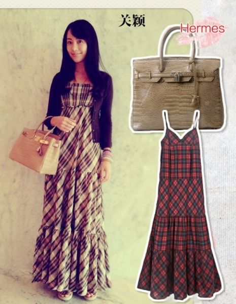来看台湾千金小姐关颖的春季爱马仕系列!首先是棕色蛇纹爱马仕铂金包,黑色小外套搭配格子长裙,走清新田园风格,不看包包那就是日系森女风,自然清新,手上挽着爱马仕,身份地位又不能忽视,的确是千金小姐!
