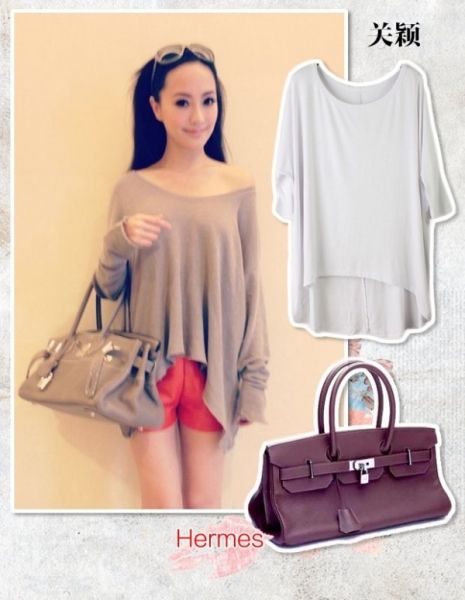 关颖爱马仕系列二,长形爱马仕包,露肩大T恤,意外搭配了红色小短裤,青春活力不少,看上去就是个非常时尚的明星!
