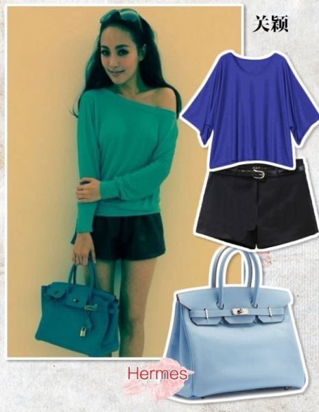 关颖爱马仕系列三,蓝色经典款爱马仕包包!搭配蓝色露肩长袖T恤,黑色小短裤,整体色系明确,艳丽性感,女性魅力展露无疑!