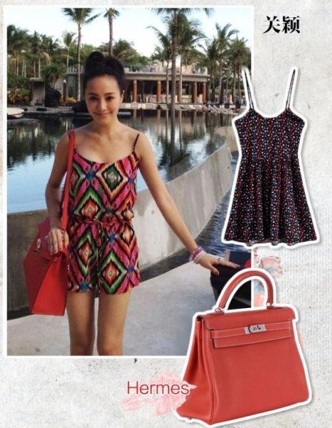 关颖爱马仕系列四,红色方形爱马仕包包!依稀民族风印花吊带连身短裤,青春洋溢,非常适合夏日。