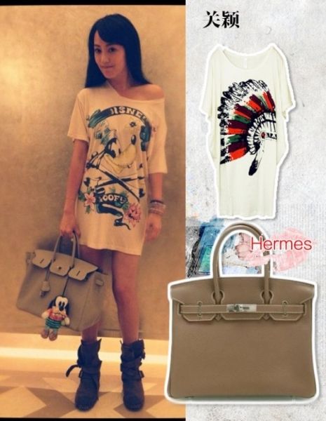 关颖爱马仕系列五,灰棕色爱马仕包包!长款个性T恤,机车靴,一副朋克风格,手上居然拿着爱马仕包,看来这包百搭,什么风格都能混搭!