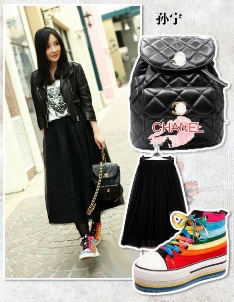 孙宁出街一套甜美私搭,手上拿了Chanel的链条双肩包,黑色机车皮衣,白色T恤,热门黑纱半身裙,五彩高帮鞋,整套装备虽然略显臃肿,但却是春季出街一套优秀私搭!