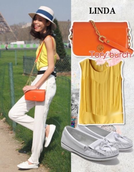 依旧是美丽俏佳人主持人linda清新风格,黄色背心T恤,白色长裤,搭配Tory burch橘色包包,白色流苏平底鞋,春季估计单薄了些,但可以留着在夏季效仿!
