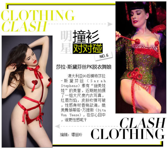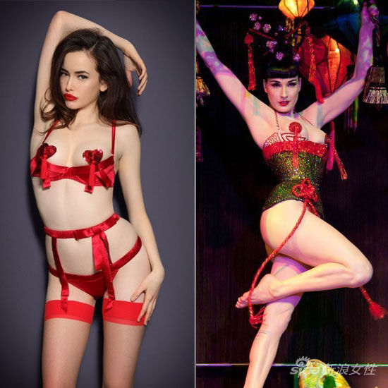同样是红色贴乳内衣,谁演绎的更加精彩呢?澳大利亚超模莎拉·斯黛芬丝(Sarah Stephens)大眼高鼻厚唇,海藻般的长发,甜美笑容,瓷器般的光滑皮肤,宛如精致漂亮的芭比娃娃。而舞娘蒂塔-万提斯((Dita Von Teese)性感妖媚,她的一举一动均挑动男人的每一根神经。