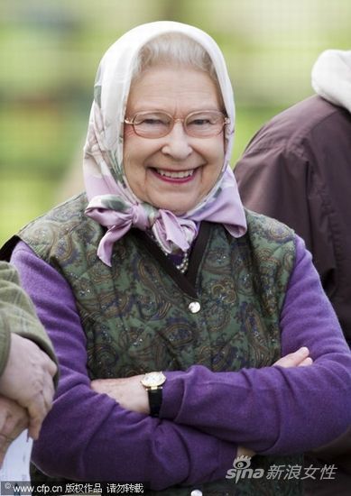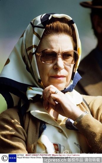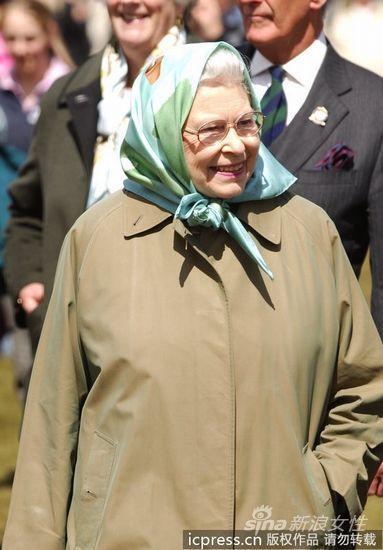 当地时间2012年5月11日,英国温莎,英国女王伊丽莎白二世观看自己的爱马在皇家温莎马术表演上的表现。女王头巾造型突显田园风采。