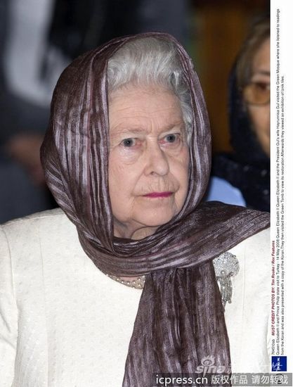 2008年5月14日,王伊丽莎白二世和菲利普亲王对耳其进行国事访问。女王伊丽莎白二世米白色的大衣搭配紫色的头巾,很高贵,很优雅。