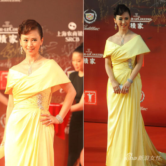 翁虹的鹅黄色礼服裙搭配整套的耳环、项链、手镯,珠光宝气,很有贵妇的气质。