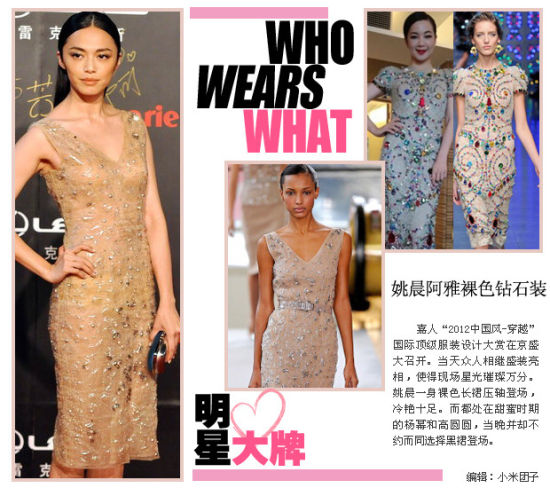 姚晨出席嘉人“2012中国风-穿越”身着Philosophy礼服。裸色刺绣裙镶嵌闪片与珠宝装饰璀璨异常,组合尖头裸色小高跟展现大女人气场。