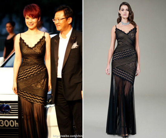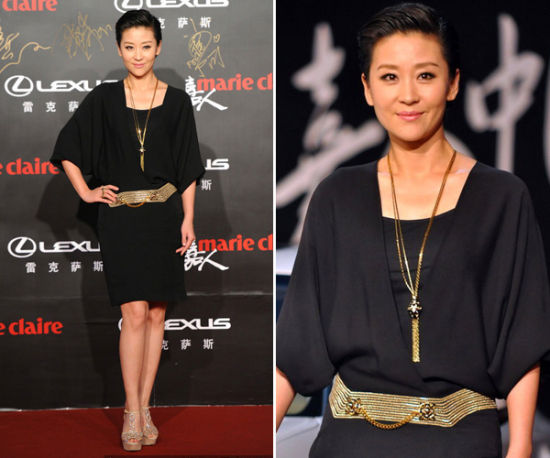 海清出席嘉人“2012中国风-穿越”身着庄司正礼服。三种花纹样式的蕾丝交叠拼接,让这条黑色礼服裙充满性感魅惑,黑色的款式和特殊的倾斜花纹,让原本身材丰腴的海清看起来身材玲珑有致,只是那一头红发和礼服有些格格不入。