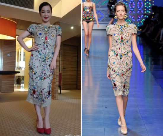 阿雅出席嘉人“2012中国风-穿越”身着Dolce & Gabbana 2012春夏系列。同样是裸色镶嵌裙装,阿雅的款式因为珠宝的色彩更加具有民族风情,而红鞋红唇的搭配更加风情万种。阿雅更在微博上吐露:感谢大S(微博)赞助的紅鞋,有亲戚在北京真好!
