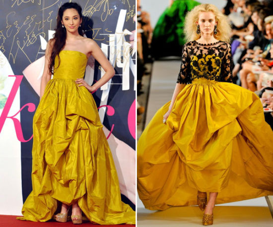 吴佩慈(微博)出席嘉人“2012中国风-穿越”身着Oscar de La Renta2012春夏系列。宽大而夸张的褶皱裙摆也只有九头身美女才可以驾驭的了。没有选择秀场款的黑色蕾丝罩衫,使群装更加清纯但是颈间未免太素净了些。