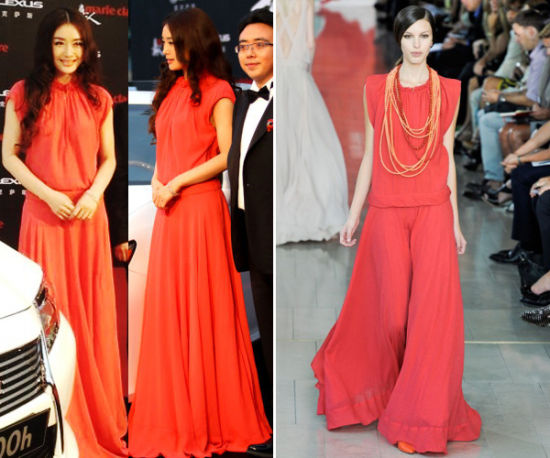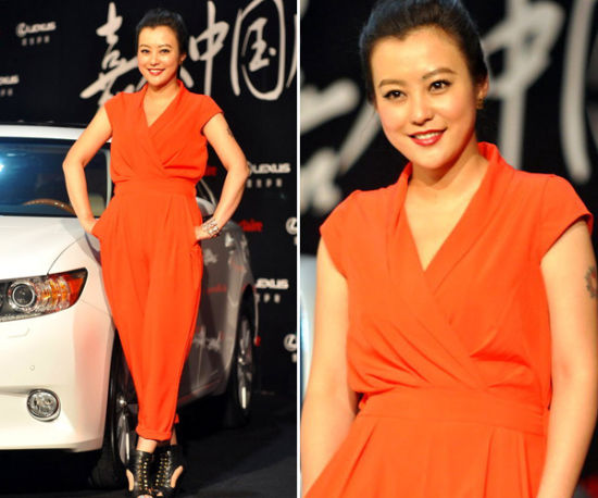 秦岚(微博)出席嘉人“2012中国风-穿越”身着Tory Burch 2012春夏系列。拖地红裙让秦岚此次十分抢眼,胸前的褶皱更是尽展小女人风情,看来秦岚最适合的还是甜美风格的着装。