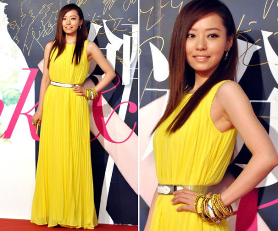 张靓颖百褶款式明黄色礼服。看看街拍和红毯上的明星,你就会知道今夏明黄色是有多受宠。明黄衬托了张靓颖略显暗淡的肤色,配上长发和层叠手环还有点吉普赛女郎的小风情。