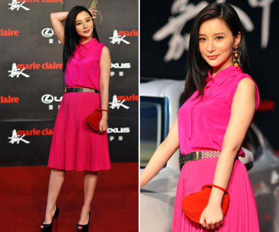 熊乃瑾(微博)没有选择华丽隆重的礼服,而是用清爽的桃红色衬衫裙展露甜美,看看手上的俏皮心形手袋就知道这个小妮子(微博)对这身搭配有多用心。