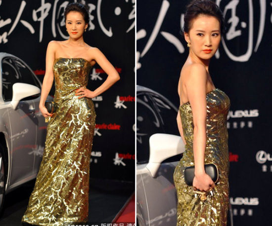 李念(微博)从蜗居中的小姑娘晋升辣妈级别,自然穿着风格上也来个180度大转变。抹胸金色礼服裙霸气十足,树枝样式的立体装饰让让李念看起来像是个“火树银花”的女子。