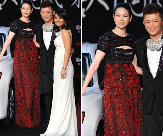 韩雨芹(微博)黑白刺绣印花礼服裙,颇有中式旗袍风格,加上偏分的发式让韩雨芹看起来像极了旧上海的社交名媛。