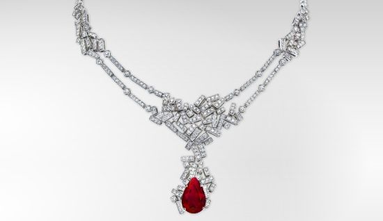 这款红宝石项链是巴伐利亚的马克西米利安·约瑟夫公爵送给爱女伊丽莎白·亚美莉·欧根妮也就是“茜茜公主”的生日礼物。整条项链由无数白色钻石和一颗罕见的水滴状红宝石构成,除了可以当做项链戴在颈间还可以作为头饰,可惜最后不幸失传。巴黎美爵在2012年根据封存的图纸凭借精湛绝伦的工艺重塑了这件传世瑰宝,每颗钻石,仿佛都蕴涵着无限能量,穿梭在过去与现在,神秘、经典的气质呼之欲出。