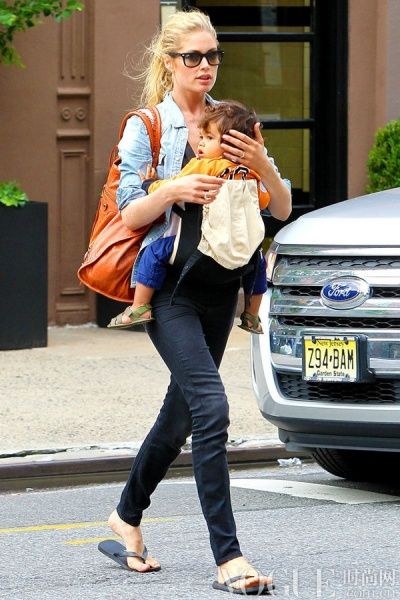 杜晨-科洛斯(Doutzen Kroes)脚蹬人字拖背baby出街,小家伙橘色运动装与机车包包相呼应,其乐融融。