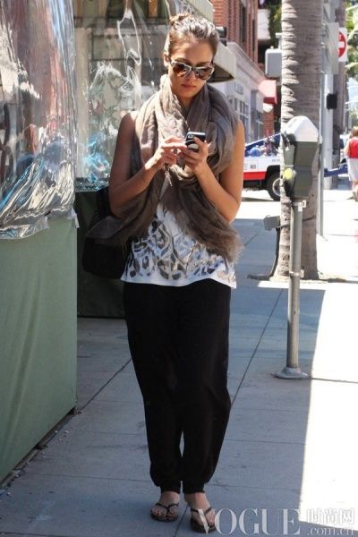 杰西卡-阿尔芭(Jessica Alba)人字拖配搭锥形裤,颇具个性。