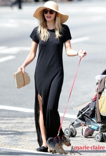 知名牙缝妹在遛狗狗的街拍中也搭配了一款利落的草编手拿包哦!黑色修身罩裙搭配草编帽包,穿衣风格俏丽时尚,加分不少哦!简单的裙搭配一款贵妇级别草帽,这一身清新的造型去海边度假吧!