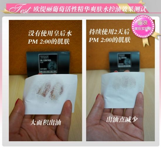 从上图中可以明显看出这款欧缇丽葡萄活性精华爽肤水对于面部肌肤出油情况的确有所改善,而且这款精华爽肤水可以作为定妆水使用令编辑非常心喜。