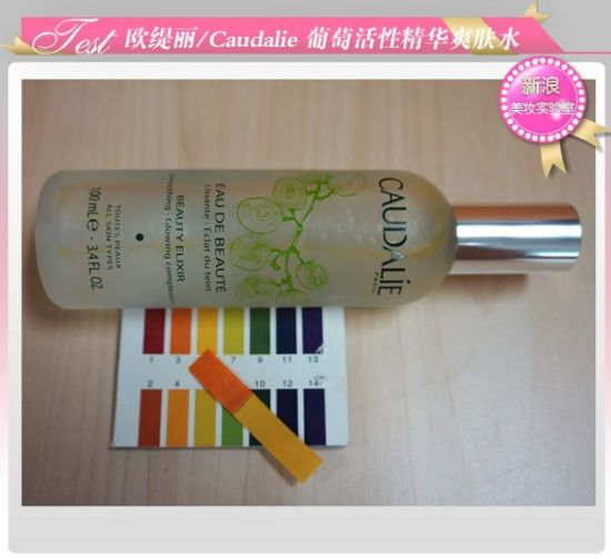 从图中可以看出欧缇丽葡萄活性精华爽肤水的PH值是偏弱酸性,PH试纸呈现在4左右,完全适宜肌肤随时使用。