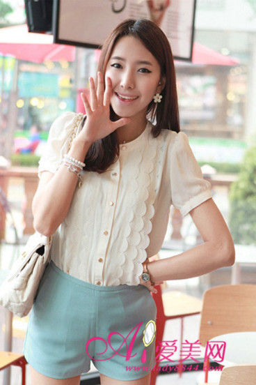 小编解析:名媛气质的雪纺衬衫,非常的知性而气质,小小的鱼鳞褶皱点缀,打破单调又百搭,淡蓝色的短裤显露美腿显高指数飙升!