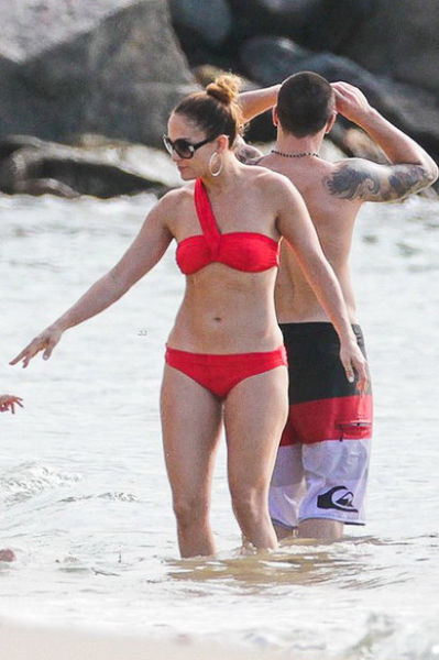 拉丁天后Jennifer Lopez一身红色比基尼和小男友比肩海滩,健硕的身材一览无遗。