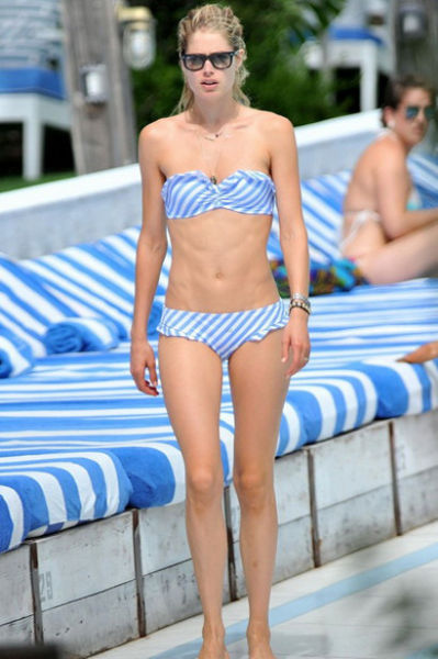 已经升级为妈的荷兰超模杜晨·科洛斯(Doutzen Kroes)身材依旧超纤细,蓝白条纹抹胸比基尼把她衬托的好似还只是一个未发育的少女。(来源/YOKA)