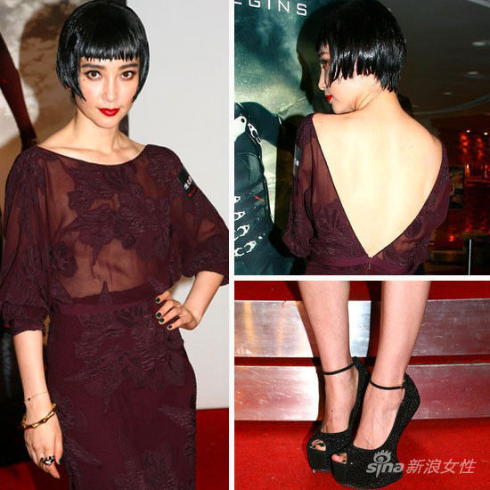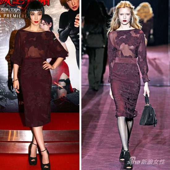 9月5日,李冰冰现身香港出席电影《生化危机之灭绝真相》的首映礼。她以一俏皮的波波头现身,穿着Gucci(微博) 2012-13秋冬系列酒红色花朵图案织印紧身裙现身。