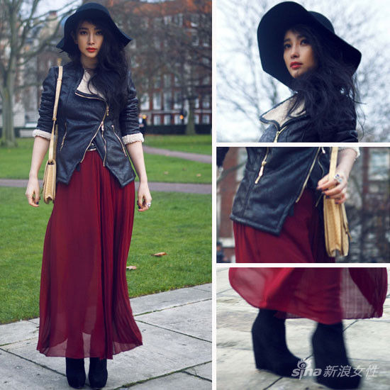 黑色皮衣,宽檐帽搭配酒红色长裙和嫩黄色单肩包,李冰冰越来越有女神范儿了。