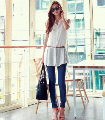 相比Angelababy,道晖芝也能穿出大牌的范儿,简单的衬衫收腰搭配一条深色系紧身牛仔裤,感觉很高挑,气质很好!