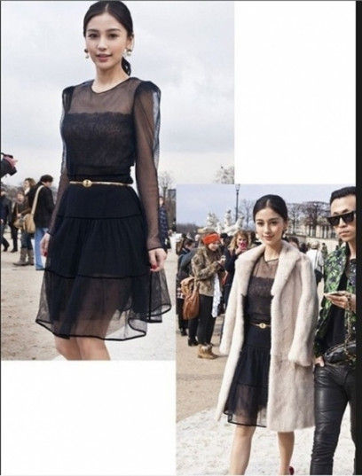 Angelababy不错的连衣裙,黑色网纱透视设计,现在大牌们都最爱了,就在冬季搭配一件大衣外套,也非常有范儿!